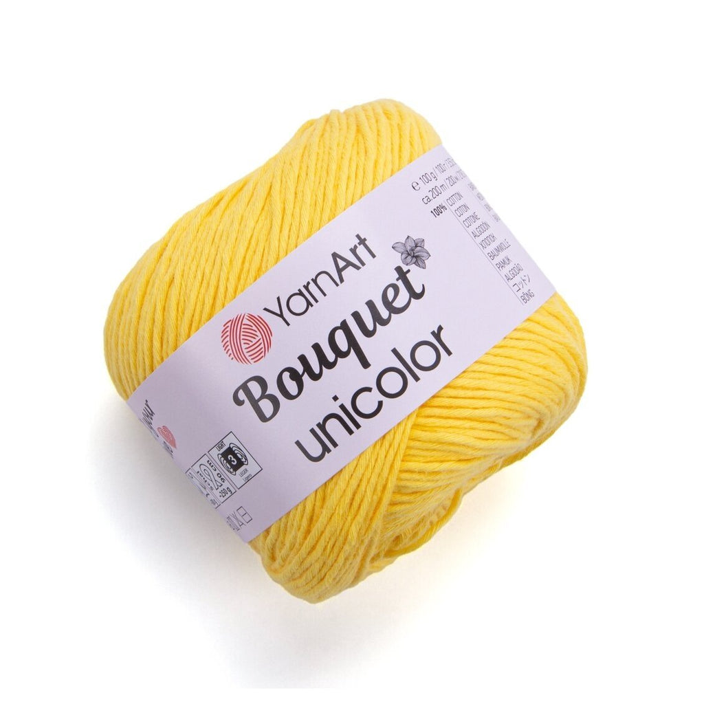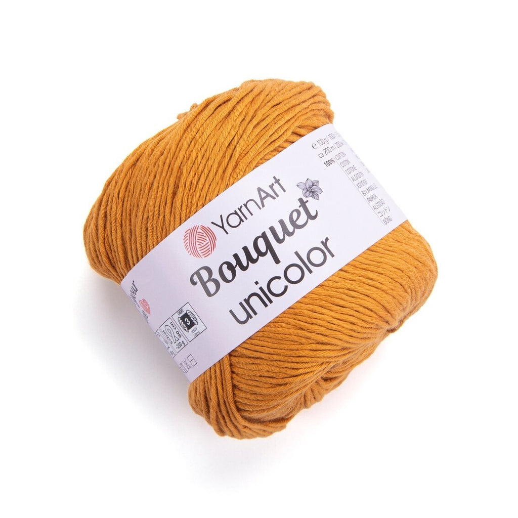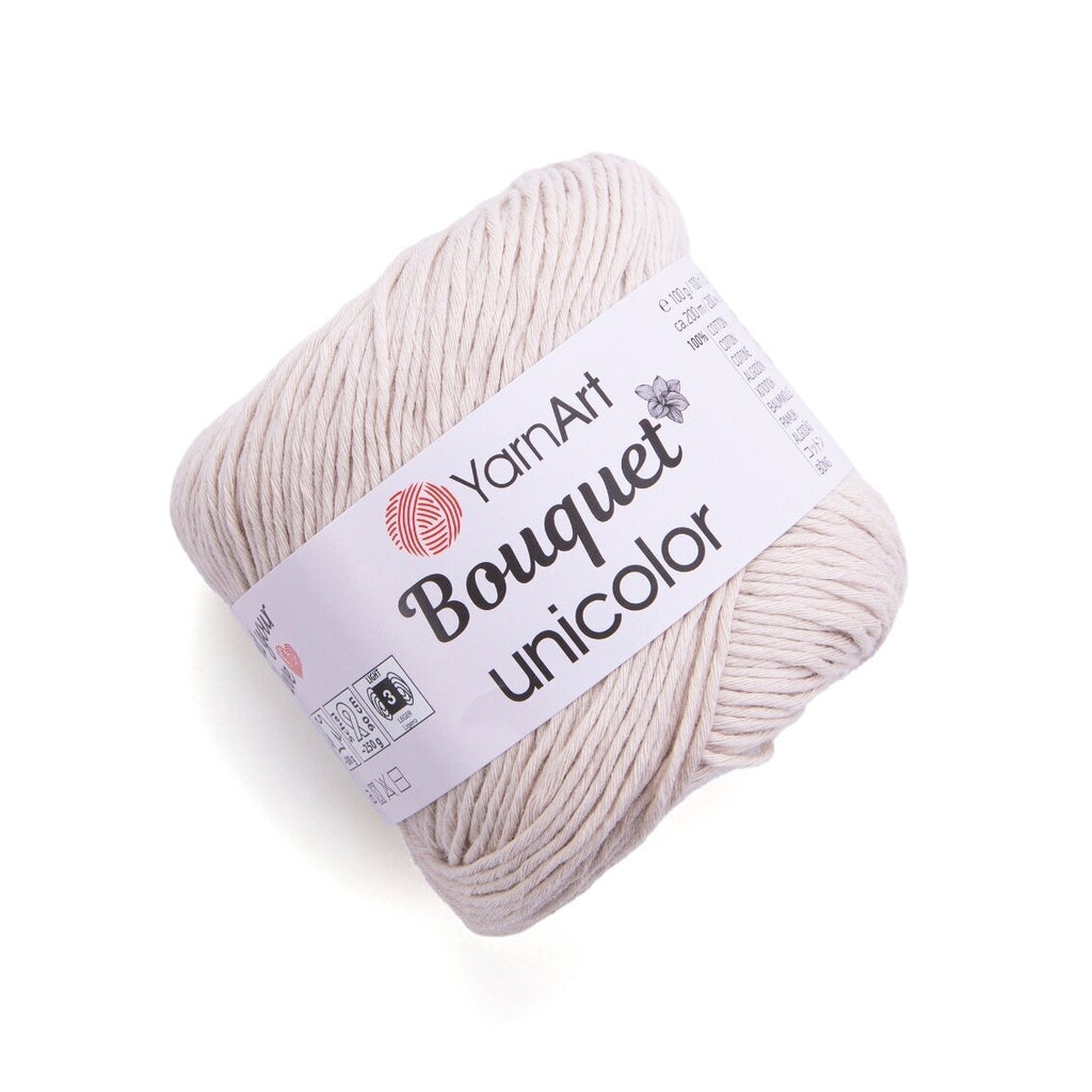 YarnArt Bouquet Unicolor ir populāro "Bouquet" cake dziju vienkrāsains papildinājums. Šīs 100% kokvilnas dzijas raksturo matēta apdare, mīksts pieskāriens un biezāks pavediens nekā standarta vasaras dzijām. Tās ir izstrādātas, lai perfekti saderētu ar raibajām Bouquet cake dzijām, ļaujot paplašināt savus projektus ar vienkrāsainām apmalēm, piedurknēm vai kontrastējošām daļām.